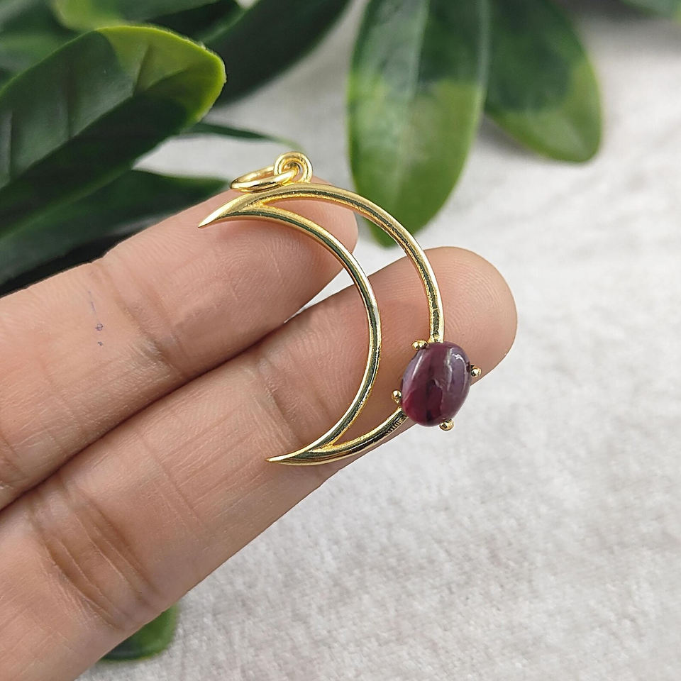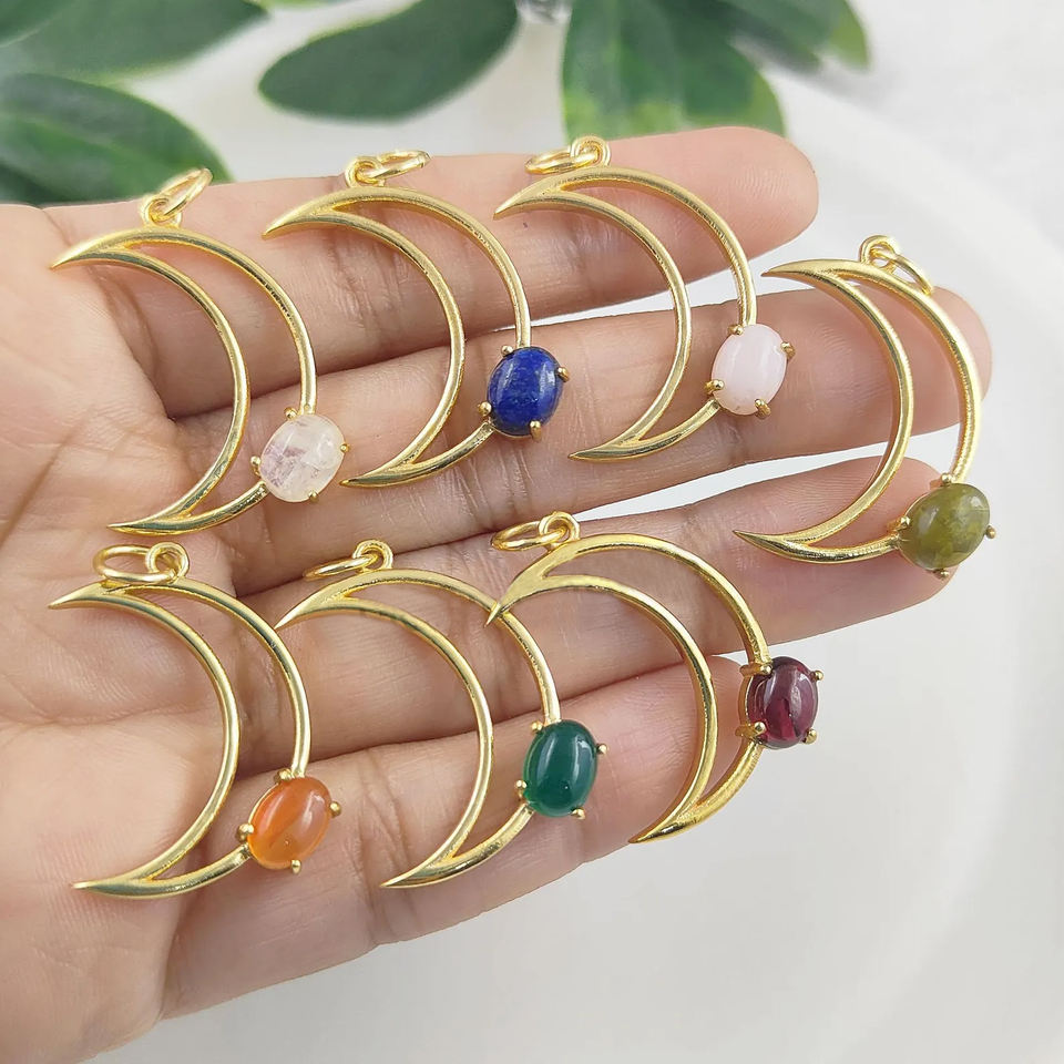 ชื่อหรือคำ:Gemstone 27mm Crescent Pendant 8x6mm Oval Prong Set Gold Plated Handmade Charm Half Moon Pendant Bulk Wholesale Jewelry Supplier