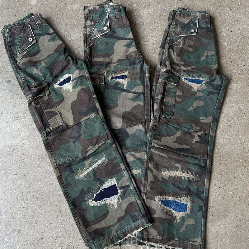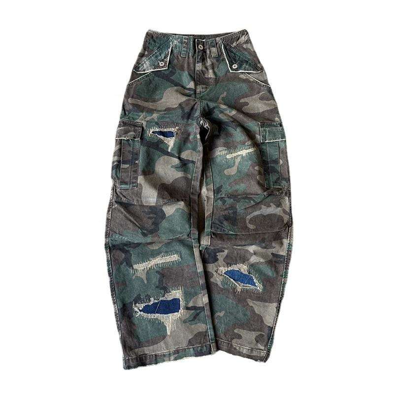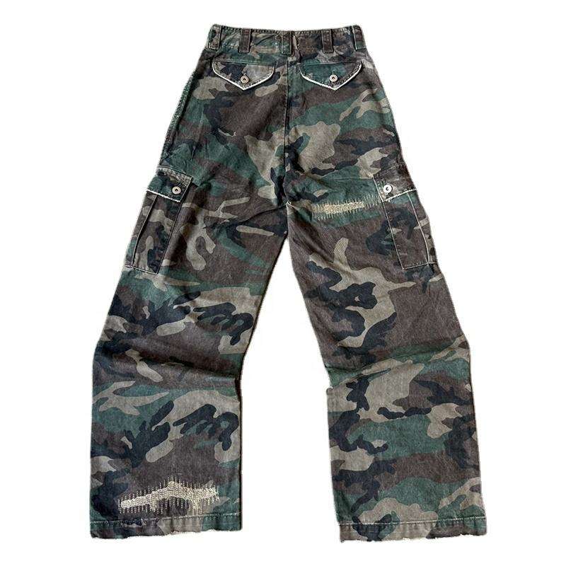 กางเกงช่างไม้ทรงปกติผ้าฟลีซแบบวินเทจ ขากว้างทรงหลวมลายพราง กางเกงวอร์มลายพราง กางเกงคาร์โก้ ปลายขาจั๊มพ์สไตล์นักขี่มอเตอร์ไซค์