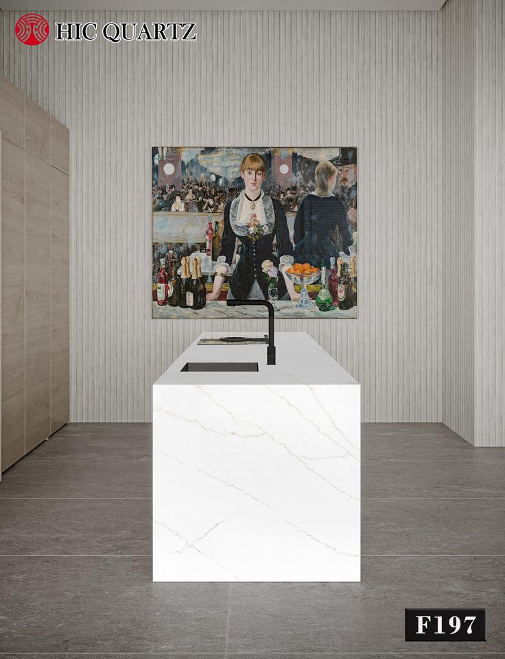 Carrara แผ่นควอตซ์วิศวกรรมสีขาวคุณภาพสูงเคาน์เตอร์ครัวที่ทันสมัยการออกแบบตกแต่งภายในแผ่นพื้นใหญ่ทนทานฮิกควอตซ์5 + ปี
