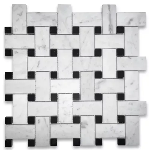 Carrara กระเบื้องโมเสคหินอ่อนสีขาวลายตะกร้ากว้างออกแบบด้วยจุดสีดำ honed สำหรับการเข้าห้องนอนห้องน้ำกระเบื้องแคลเซียมธรรมชาติ