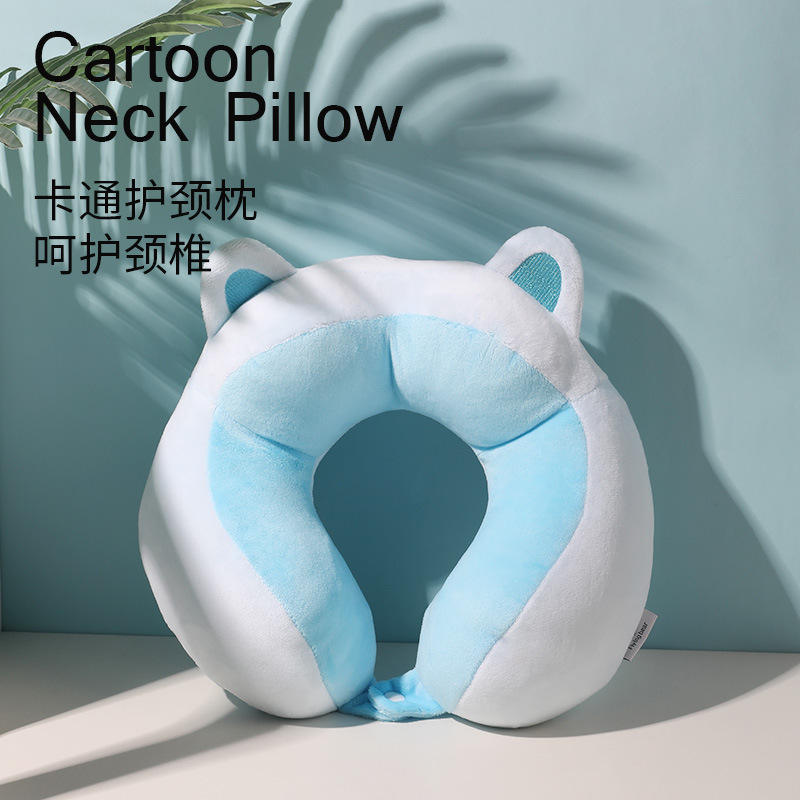 หมอนรองคอรูปตัวยูหูแมวการ์ตูนสำหรับการเดินทางและสำนักงาน สีฟ้า สีชมพู สีเทา สีเขียว สีเหลือง ขนาด 28x26x14 ซม. โพลีเอสเตอร์