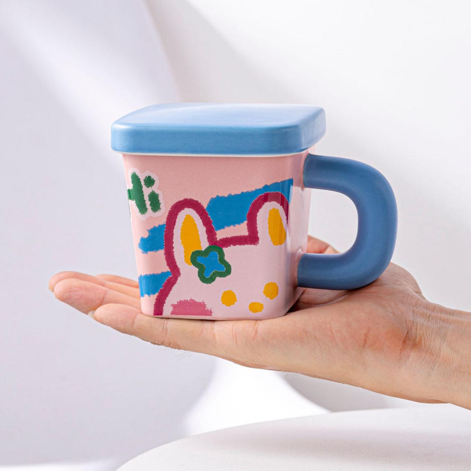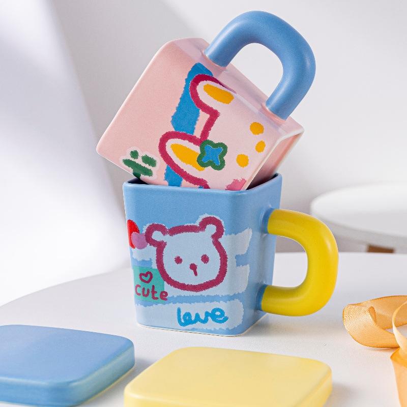 แก้วเซรามิกพอร์ซเลนลายการ์ตูนรักษ์โลก ขนาด 375 มล. ทรงเหลี่ยม สำหรับเด็กผู้หญิง คู่รัก นักเรียน-ใช้ในบ้าน สำหรับกาแฟและน้ำ