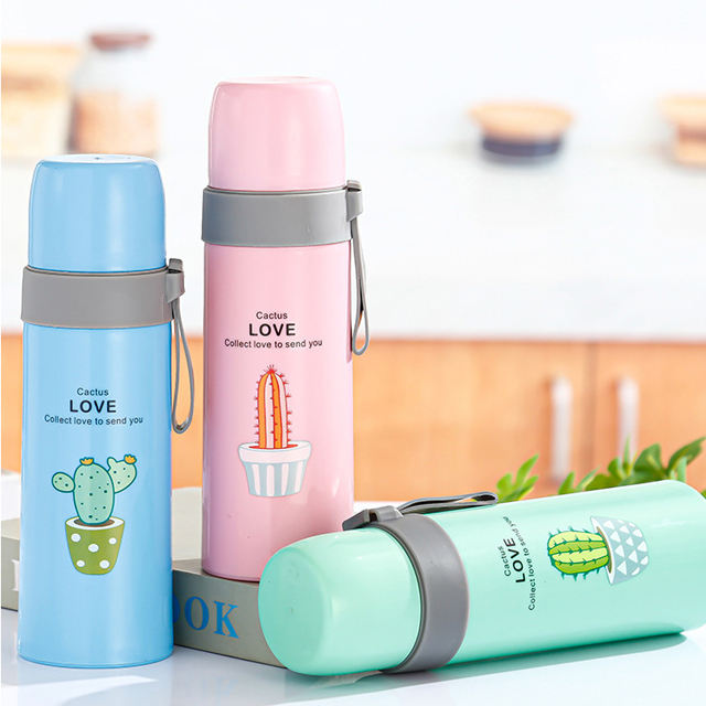 ขวดน้ำแก้วเก็บความร้อนลายการ์ตูนรูปช้าง500มล. กระติกน้ำสุญญากาศแบบพกพาสำหรับนักเรียนสีชมพูน่ารัก