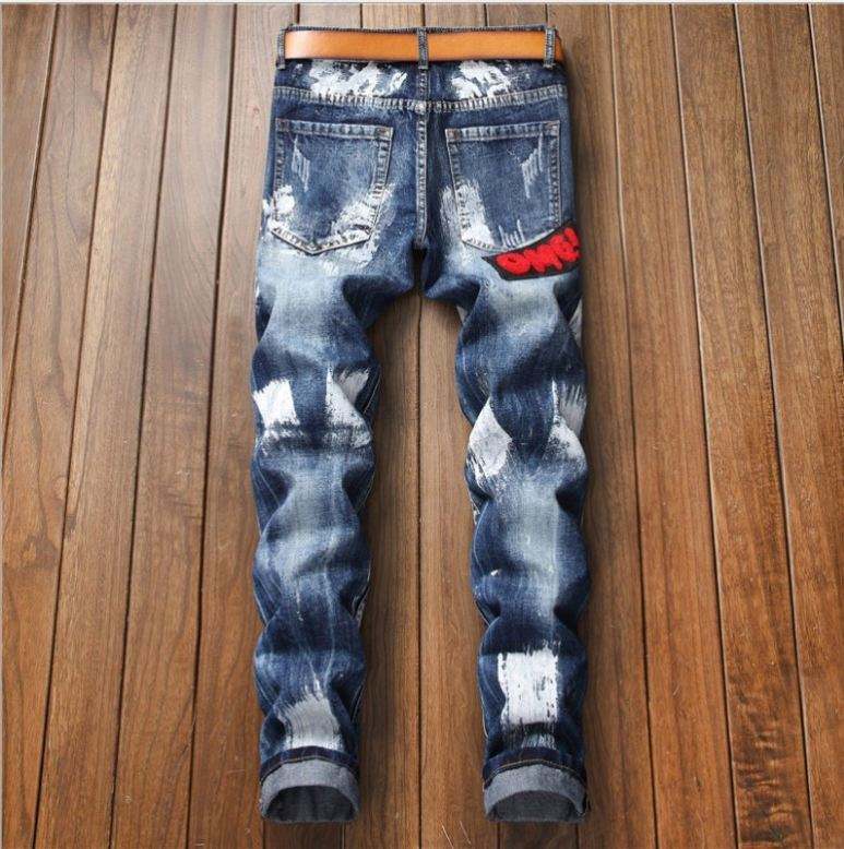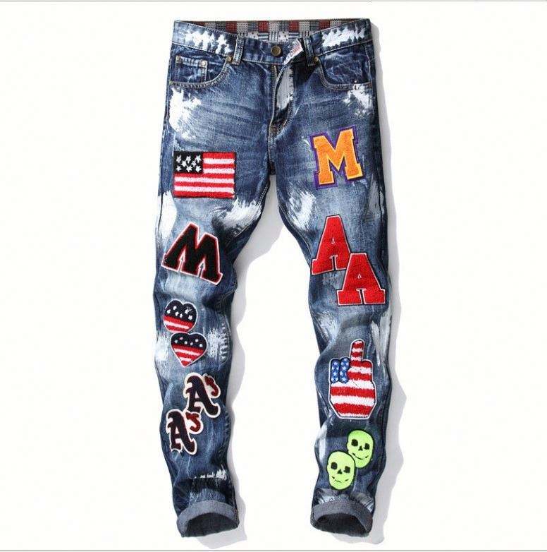 กางเกงยีนส์ปักลายการ์ตูนสำหรับผู้ชายสไตล์สตรีทขากลางเอวถักแบบลำลองสำหรับฤดูใบไม้ร่วงฤดูหนาว