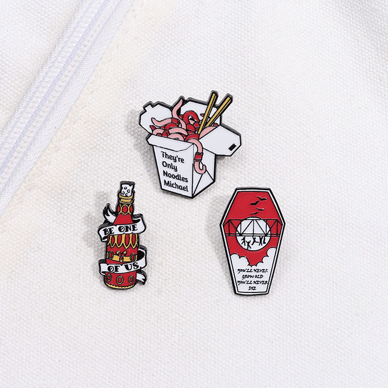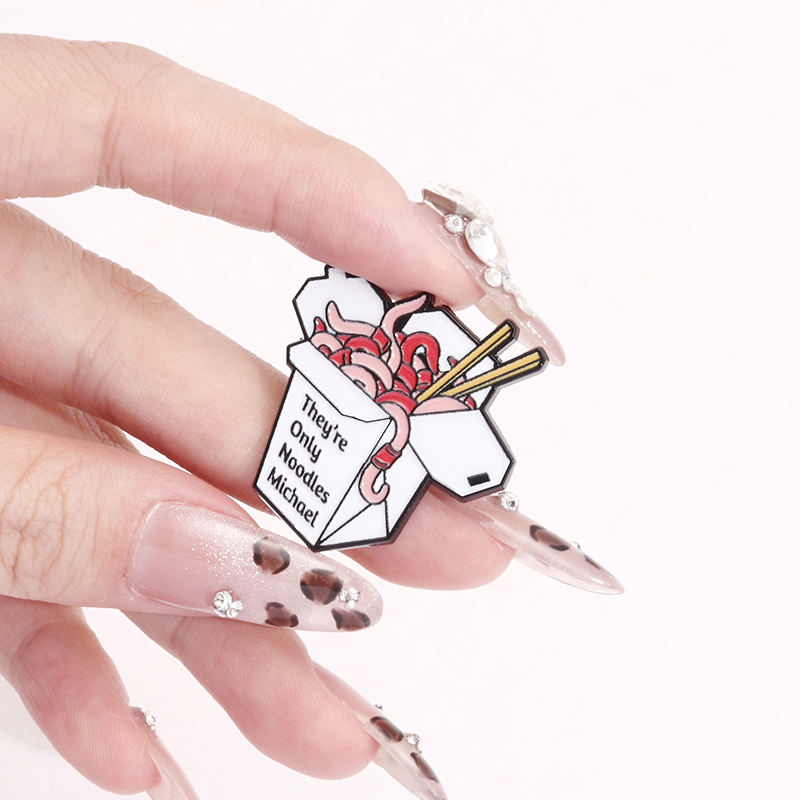 เข็มกลัดการ์ตูนเฟรนช์ฟรายส์ซอสมะเขือเทศเคลือบแบบสั่งทำเฉพาะเส้นก๋วยเตี๋ยวมีเข็มกลัดปกเสื้อเป็นของขวัญเครื่องประดับแสนตลกสำหรับเพื่อน