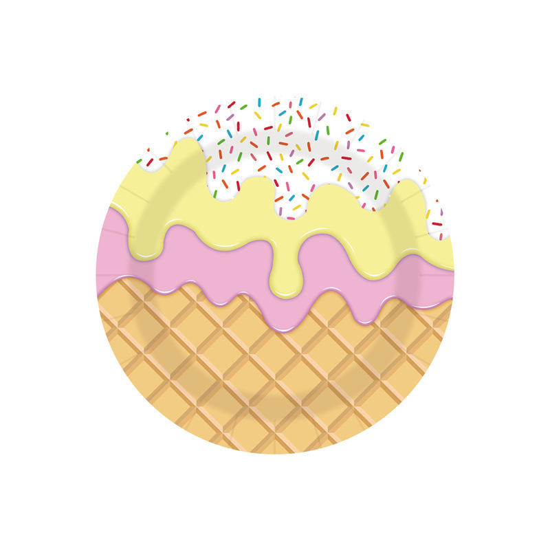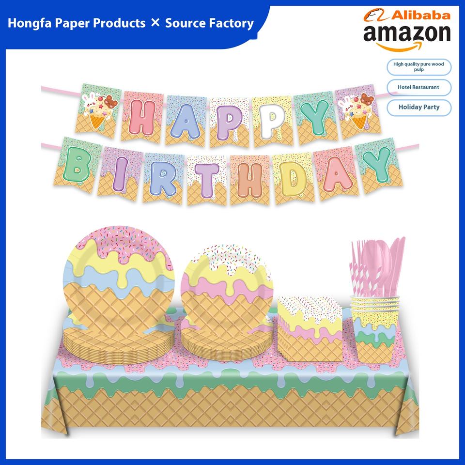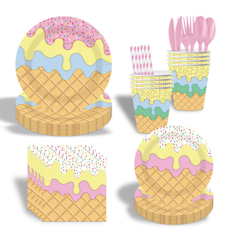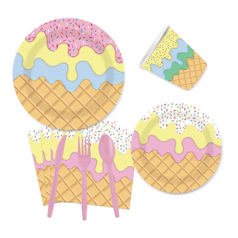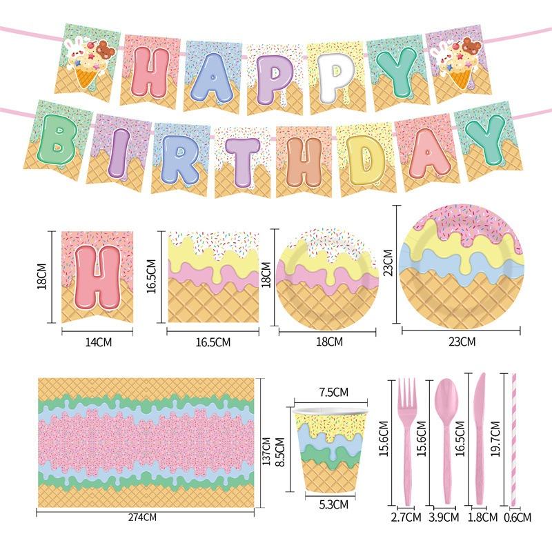 ชุดอุปกรณ์ตกแต่งงานวันเกิดธีมไอศกรีมการ์ตูน สำหรับ 10 ท่าน พร้อมป้าย แบนเนอร์ ผ้าคลุมโต๊ะ จานอาหารแบบใช้แล้วทิ้ง