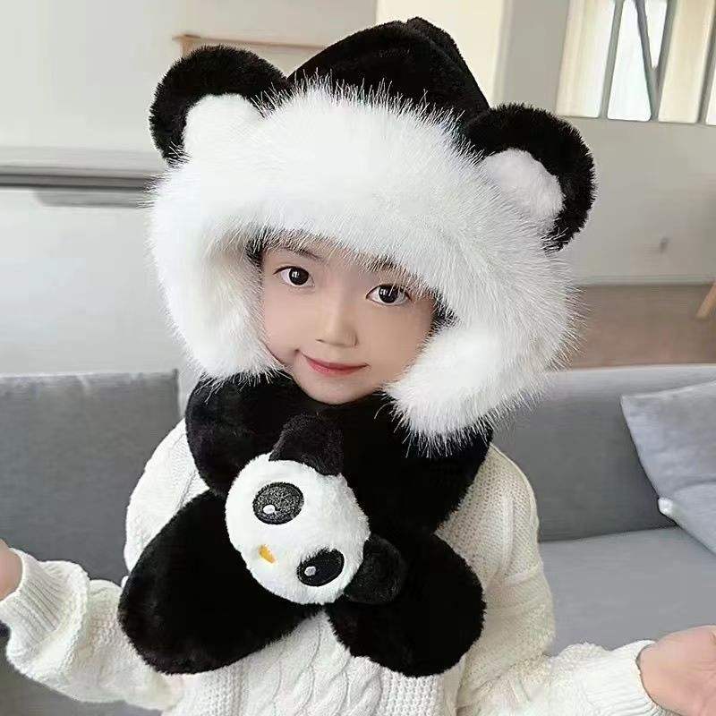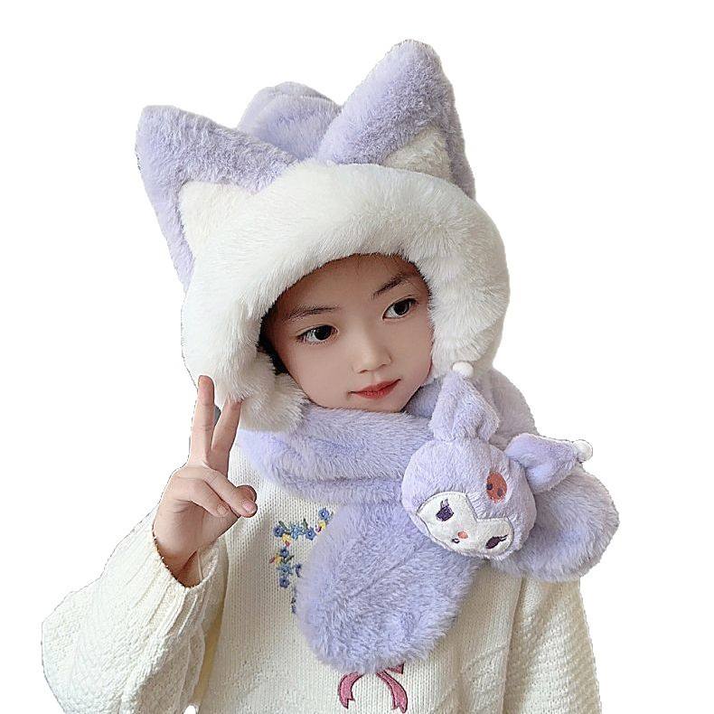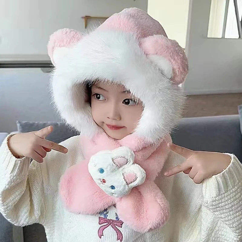 ชุดหมวกและผ้าพันคอตุ๊กตาการ์ตูนสำหรับเด็กฤดูหนาวอุ่นๆ ป้องกันคอพร้อมหูหมี สีบานเย็น ชุด 2 ชิ้น