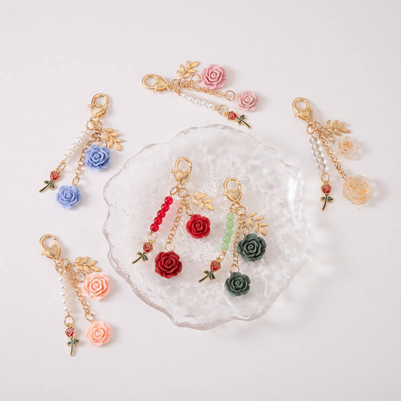 พวงกุญแจดอกกุหลาบการ์ตูนพร้อมพู่ห้อยลายสุนัข สำหรับผู้หญิงและเด็กผู้หญิง ใช้ตกแต่งกระเป๋าและพวงกุญแจลายดอกไม้