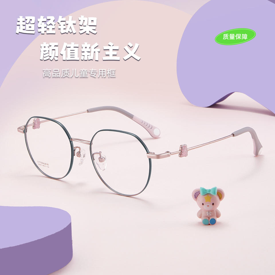 แว่นตากรอบไทเทเนียมทรงกลมการ์ตูนสำหรับเด็กพร้อมแผ่นรองจมูกแบบถุงลมนิรภัยขนาดกลางเลนส์เรซิ่นต้นกำเนิดแดนหยาง