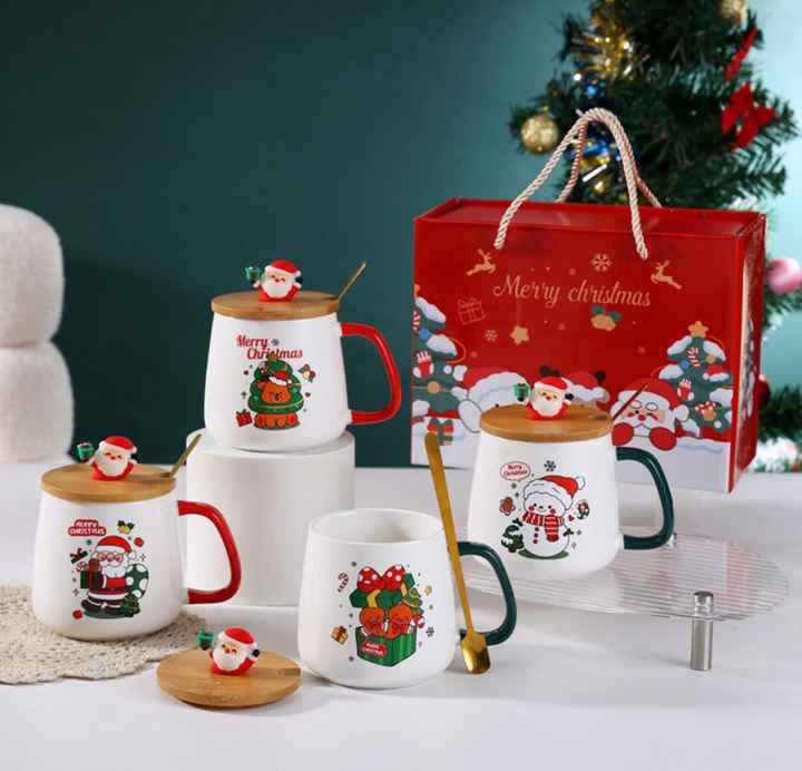 แก้วกาแฟเซรามิคลายการ์ตูนซานตาคลอสพร้อมฝาและช้อน ของขวัญคริสต์มาส แก้วมัคพร้อมกล่องของขวัญ ขายตรงจากโรงงาน รับสั่งทำ
