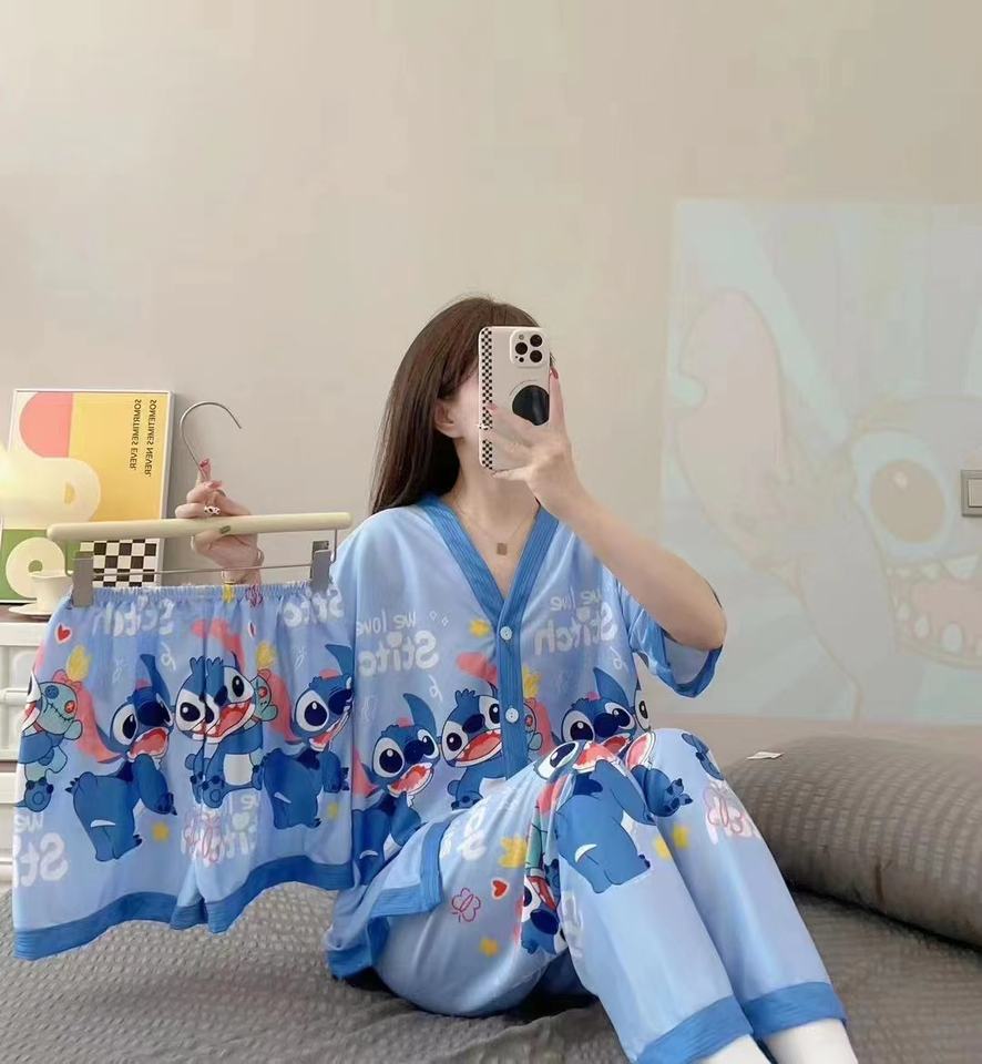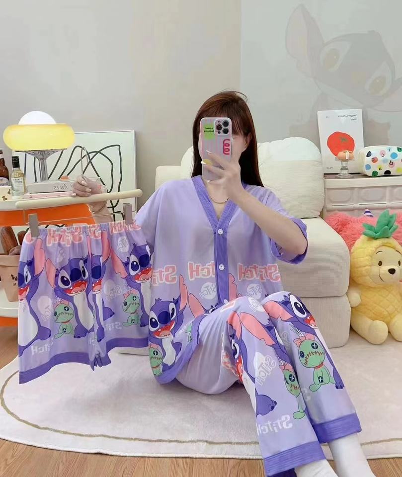 ชุดนอนผู้หญิงลายการ์ตูนแบบสามชิ้น เนื้อผ้านุ่มสบาย ชุดนอนฤดูร้อน แขนสั้น กางเกงขาสั้น กางเกงขายาว ผ้าไหมนม