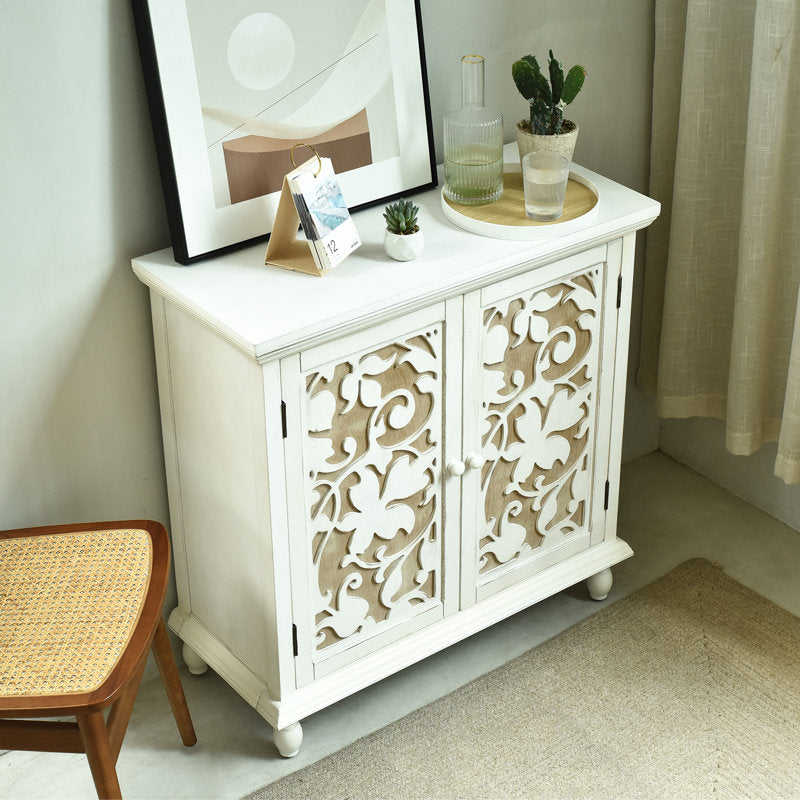 ตู้คอนโซลไม้เนื้อแข็งสีขาวสไตล์ Shabby Chic งานแฮนด์เมด บานประตูฉลุลายดอกไม้ประณีต ประหยัดพื้นที่ เฟอร์นิเจอร์สไตล์ฟาร์มเฮาส์ เหมาะสำหรับโรงแรม