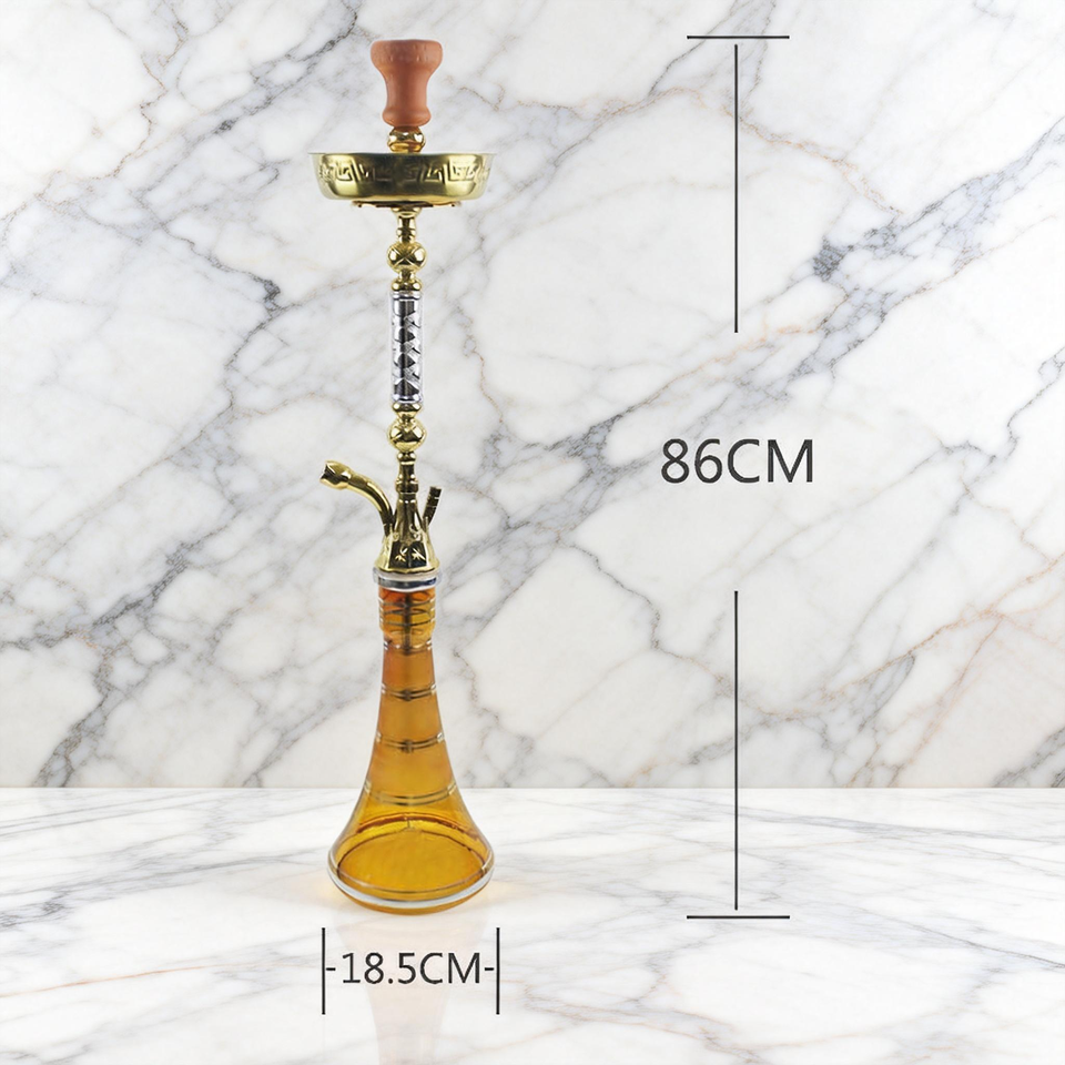 ชิชาฮุคคาโลหะสีทองแกะสลักฐานแก้วหลากสีและสายยางลายทางสำหรับเลานจ์ระดับพรีเมี่ยม