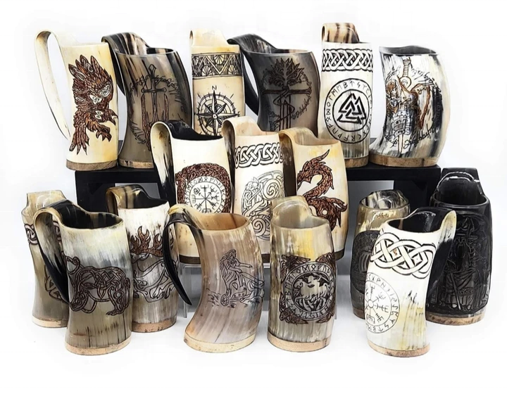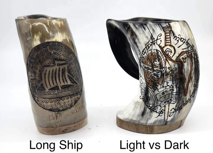 แก้วมักรูปนกฮูกแกะสลัก/วัว/โลโก้ที่กำหนดเองถ้วยดื่มแตรวัววัวยุคกลางแก้วมักทำด้วยมือแก้วแตรธรรมชาติพร้อมที่จับสำหรับขายโดย RDM