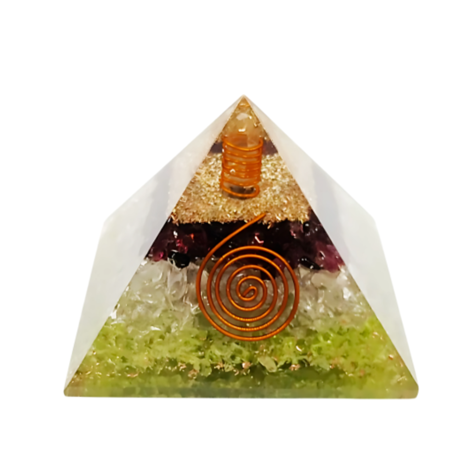 รูปแกะสลักพีระมิดโกเมนทรงสามเหลี่ยมแบบพกพาแกะสลักแบบใสรูปควอตซ์และ Peridot orgonite