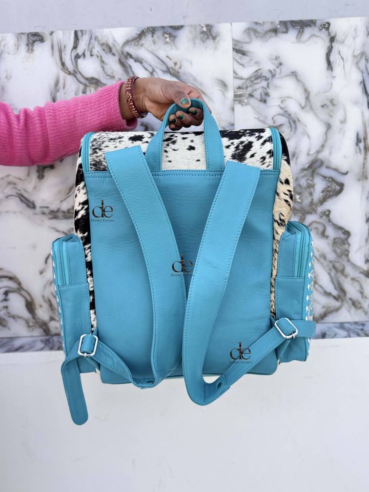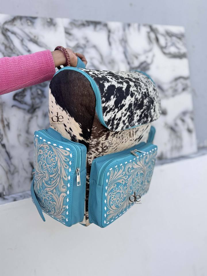 กระเป๋าเป้หนังแกะสลักลายเก๋ไก๋ สีเทอร์ควอยซ์ ขนสัตว์แท้ สำหรับทุกเพศ กระเป๋าเป้ดีไซน์สวยงาม
