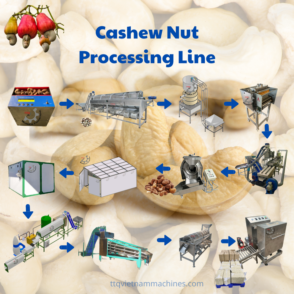 เครื่องแปรรูปเม็ดมะม่วงหิมพานต์ 5 ตัน/วัน กึ่งอัตโนมัติ สำหรับเม็ดมะม่วงหิมพานต์ดิบ เกรดอาหาร ผลิตจากสแตนเลส ผู้ผลิตจากเวียดนาม