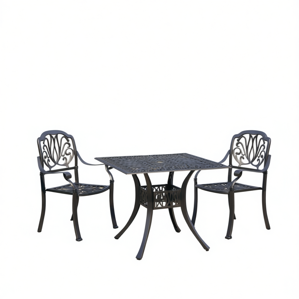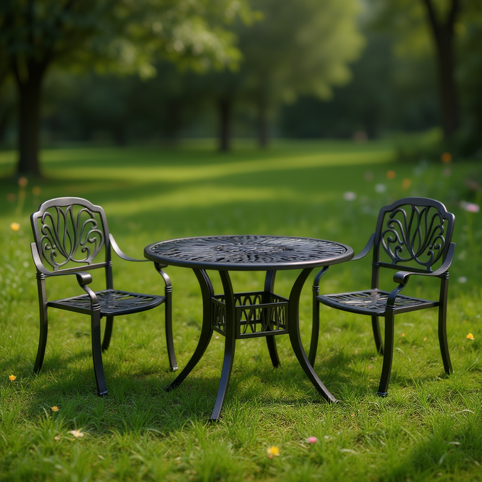 ชุดโต๊ะบิสโทรอะลูมิเนียมหล่อ 3 ชิ้น สีดำ เฟอร์นิเจอร์สวนกลางแจ้ง ดีไซน์แบบดั้งเดิม