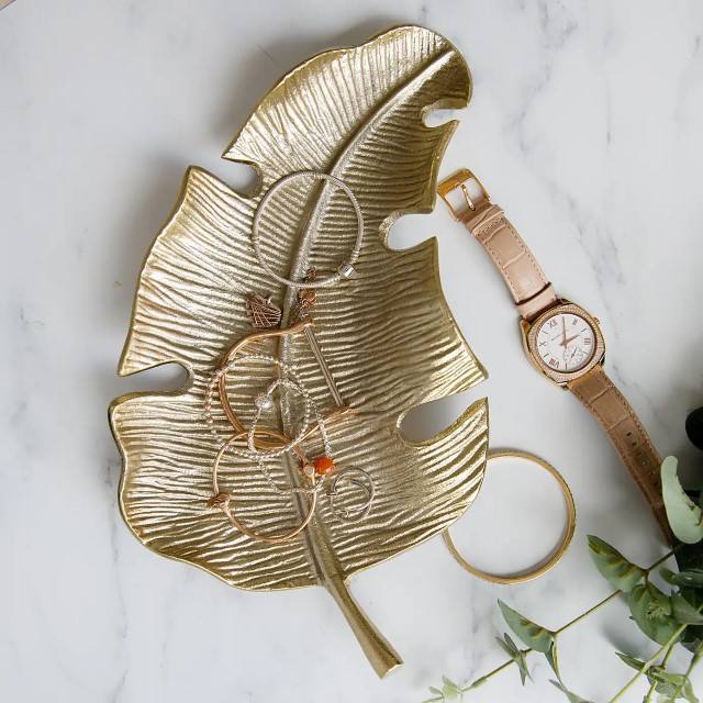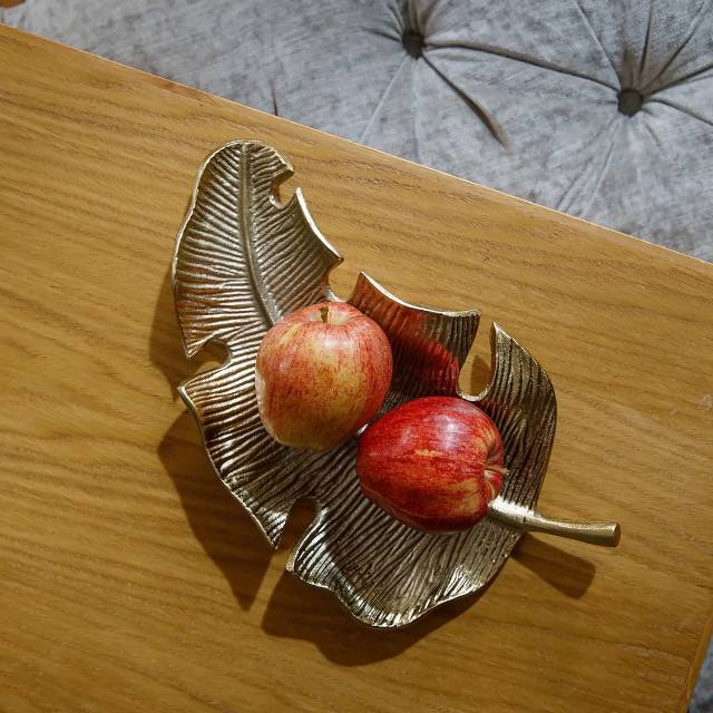ถาดเสิร์ฟใบปาล์มสีทองทำจากอะลูมิเนียมถาดอาหารแบบนำกลับมาใช้ใหม่ได้กลางโต๊ะสำหรับตกแต่งงานแต่งงานของตกแต่งบ้าน