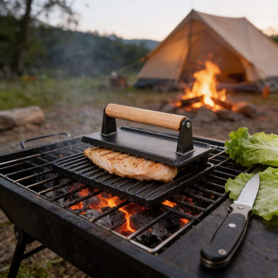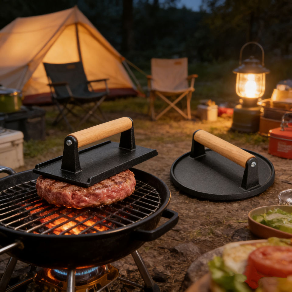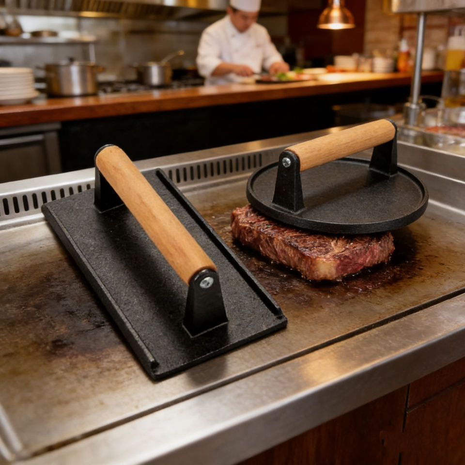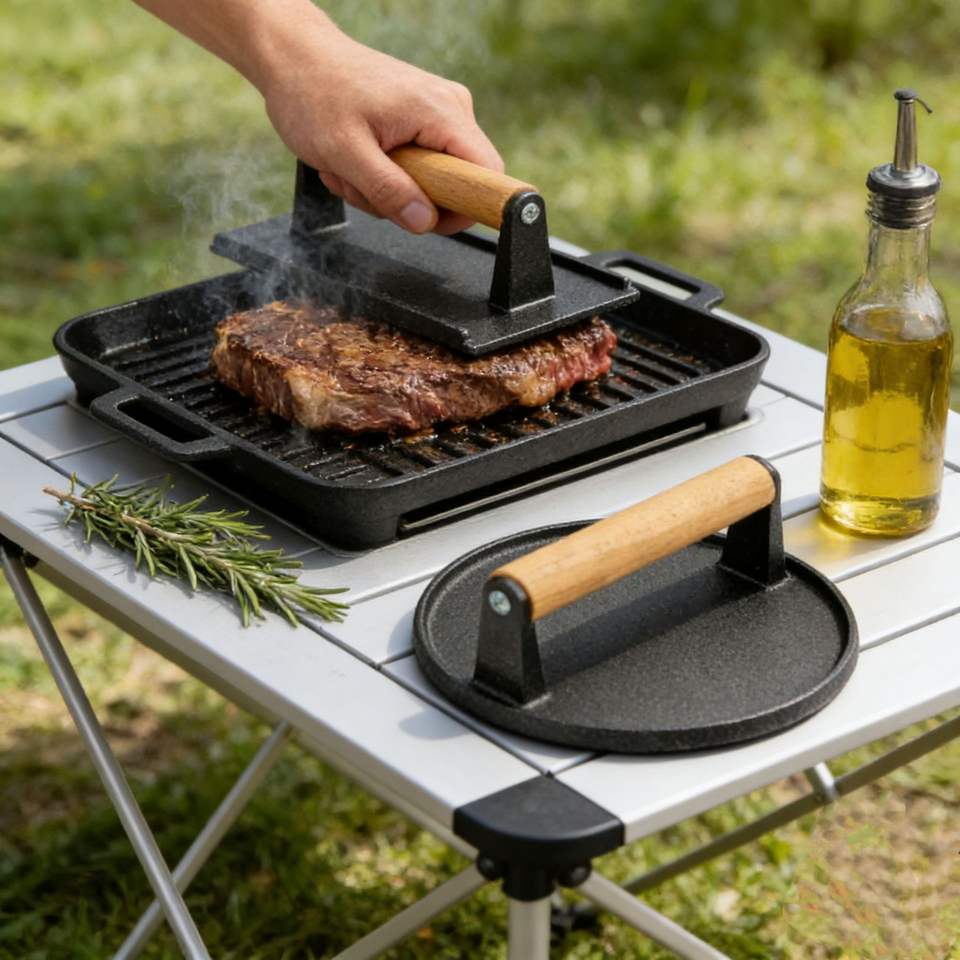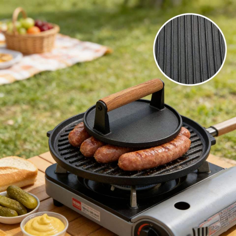 ที่กดเนื้อย่างบาร์บีคิวเหล็กหล่อทรงสี่เหลี่ยมลายสก็อต ไม่มีสารเคลือบผิว ด้ามจับไม้บีช ทำความสะอาดง่าย สำหรับสเต็กและหมูย่าง