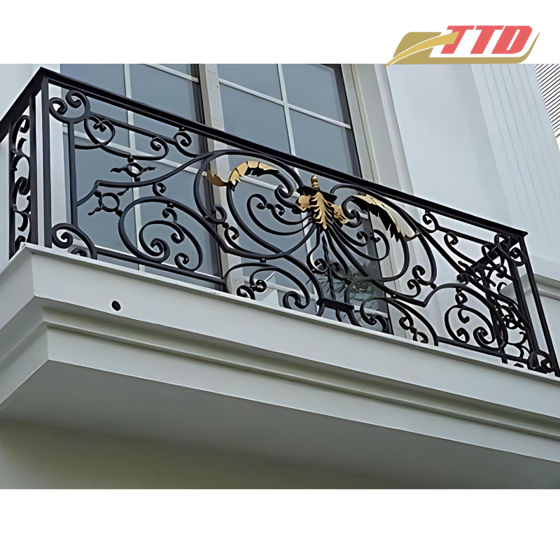 Cast iron balcony railing with traditional decorative panels for outdoor use made in Vietnam by professional ironworkers