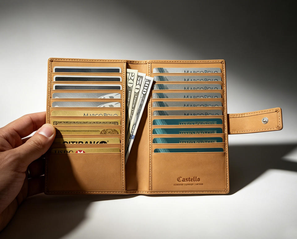 กระเป๋าสตางค์หนังวัวแท้ Castello แบบยาวบาง หนังนิ่ม แบบเปิด สีดำ/น้ำตาลเข้ม โพลีเอสเตอร์ สำหรับผู้ชาย/ทุกเพศ