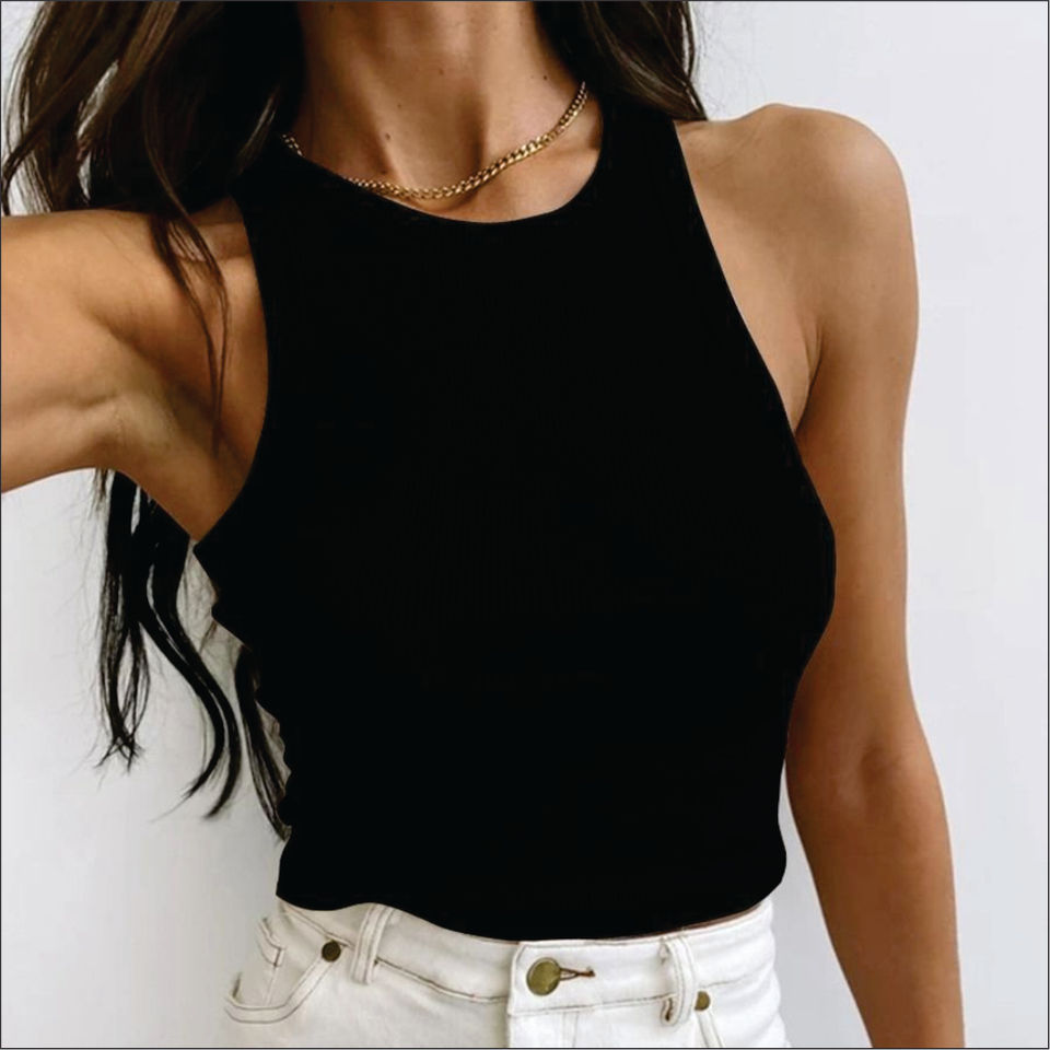 เสื้อครอปแขนกุดทรงพื้นฐานสำหรับผู้หญิง คอเหลี่ยม สายไขว้หลัง ผ้าริบ ปักลายเรียบ ผ้าฝ้าย 100%