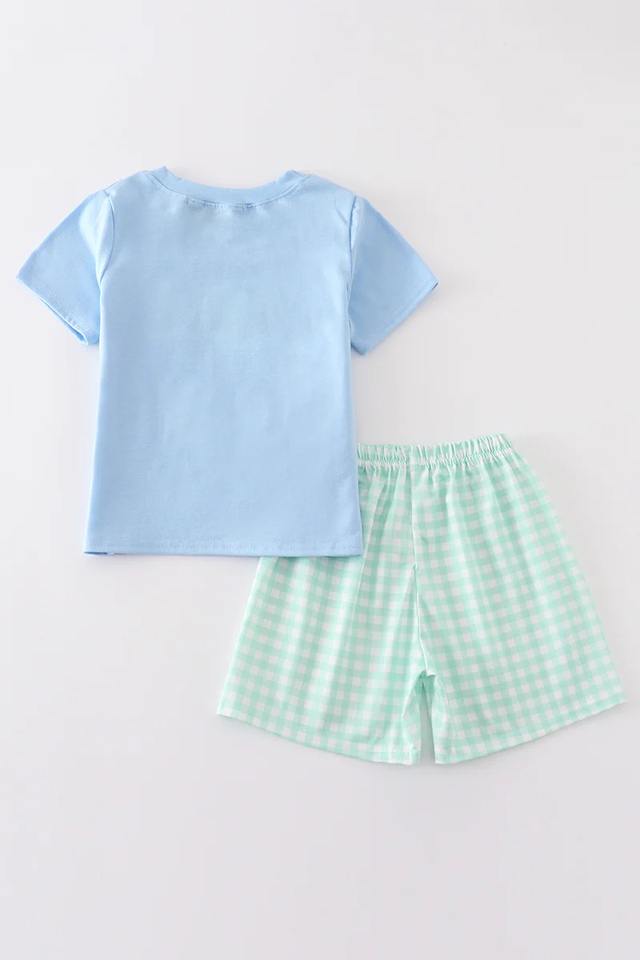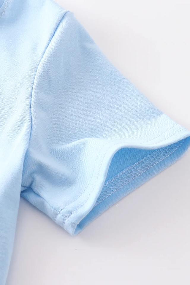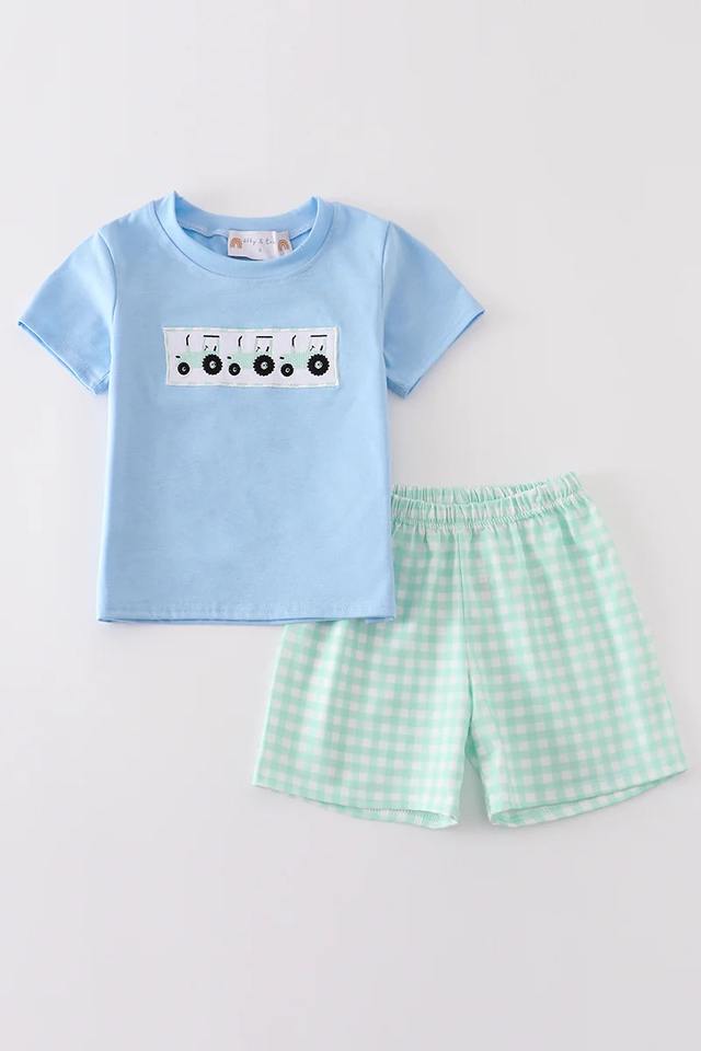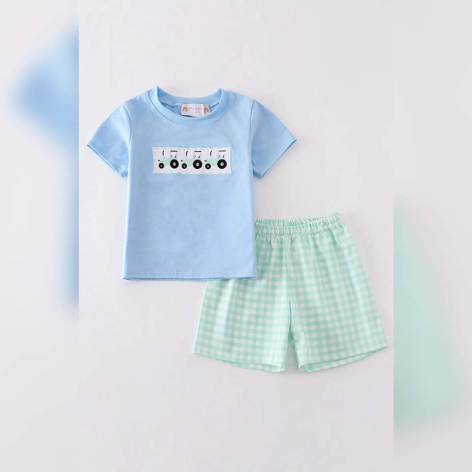 ชุดเสื้อผ้าเด็กผู้ชายปักลายรถแทรกเตอร์สีฟ้าลำลองสำหรับฤดูร้อนชุดเสื้อผ้าสองชิ้นพร้อมเสื้อแขนสั้นและกางเกงขาสั้นที่เข้ากัน