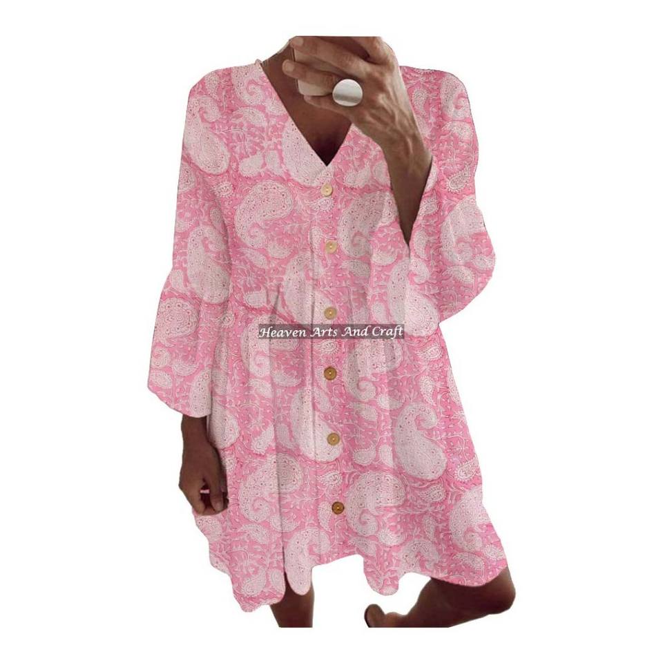 เสื้อทูนิคสไตล์โบฮีเมียนลำลอง ผ้าฝ้ายแท้ พิมพ์ลายดอกไม้สีเอิร์ธโทน ลายบล็อกพิมพ์แบบอินเดีย บากรู เสื้อคลุมสำหรับใส่ในฤดูร้อน เสื้อผ้าอินเดียและปากีสถาน