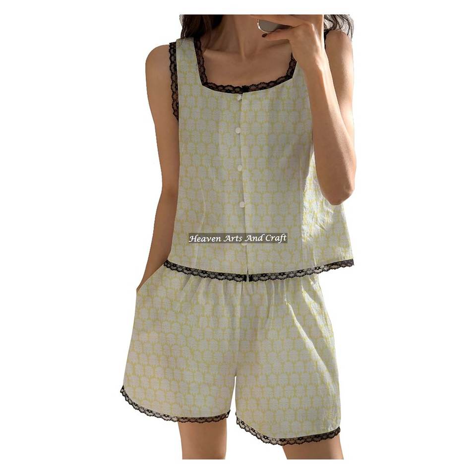 ชุดนอนเพื่อนเจ้าสาวแบบสบายๆ แต่งขอบลูกไม้ กางเกงขาสั้น ชุดนอนลายดอกไม้ แขนกุด สำหรับฤดูใบไม้ผลิ/ฤดูร้อน ลายพิมพ์บล็อกด้วยมือ