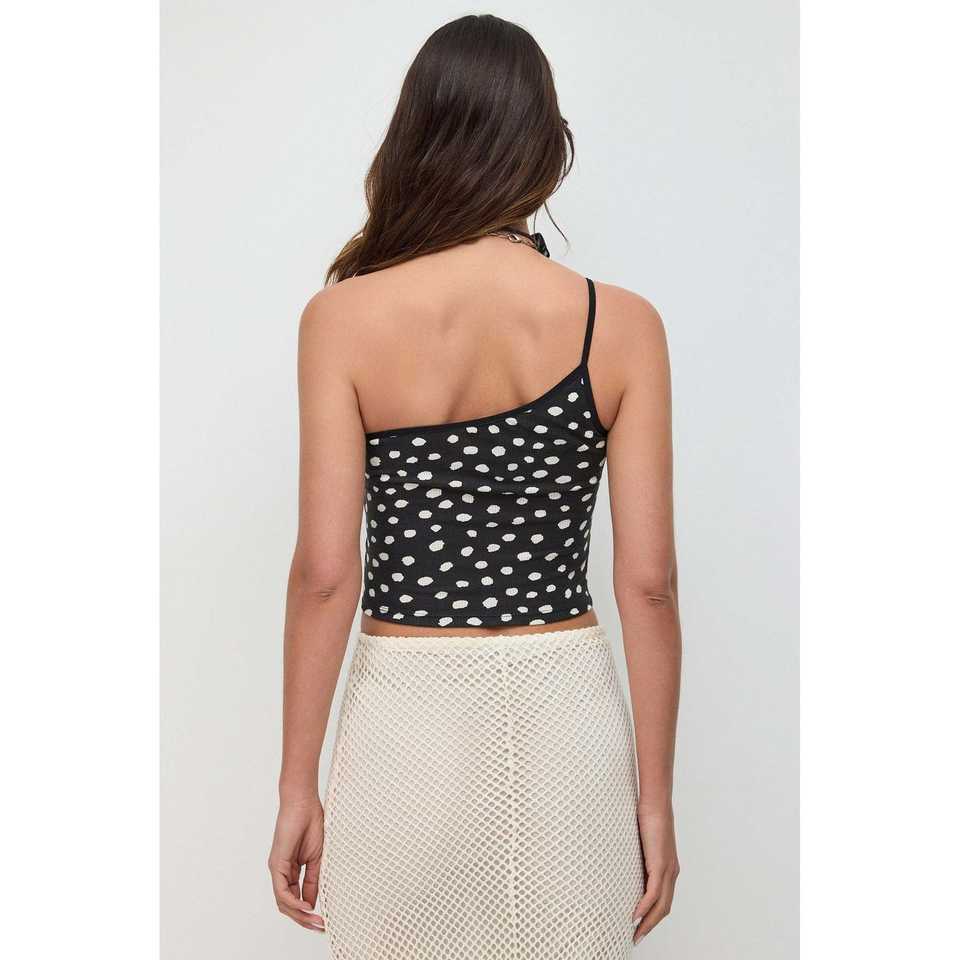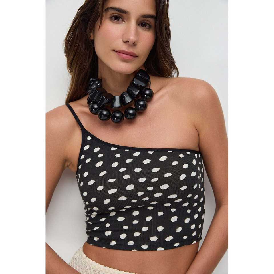 เสื้อเบลาส์คอกลมแขนสั้นแบบลำลอง สายคล้องไหล่เดี่ยว พร้อมโลโก้ด้านหน้า ความยาวสั้น ผลิตจากวิสโคส/โพลีเอสเตอร์
