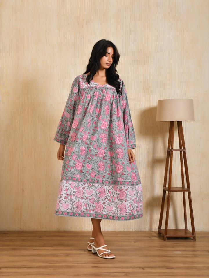 ชุดเดรสมิดิพิมพ์ลายดอกไม้ผ้าฝ้ายสีพาสเทลสีชมพูลายดอกไม้แขนบานขอบเป็นชั้นแบบลำลองสำหรับทุกวัน