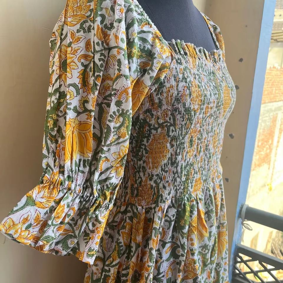 เดรสยาวสไตล์โบฮีเมียนลายดอกไม้ลำลอง ผ้าฝ้าย คอปักลายดอกไม้ คอเหลี่ยม แต่งระบายช่วงอก