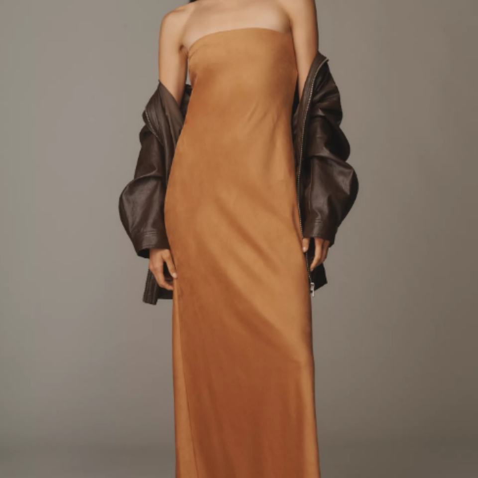 เดรสยาวปักลายดอกไม้แบบสบายๆ ไร้สายรัดไหล่ ผ้าหนังกลับเทียมระบายอากาศได้ดี ตกแต่งด้วยลูกไม้และสายคาดเอว เหมาะสำหรับออกงานกลางคืนในฤดูร้อน