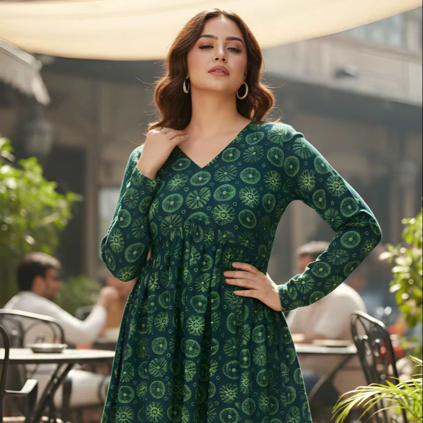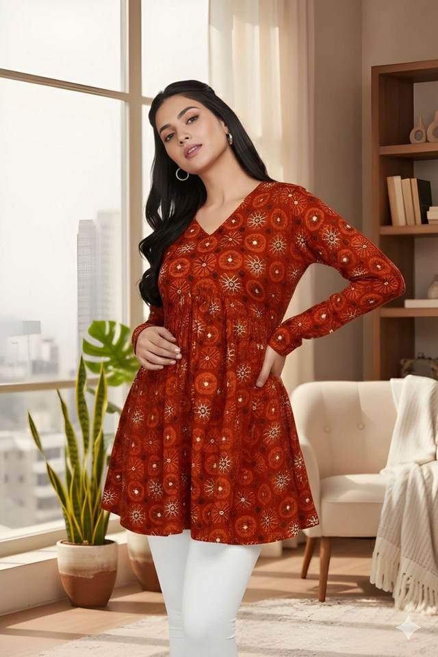 เสื้อทูนิคคอวีลำลองสำหรับสาวๆ ผ้าไหมเดลต้าพิมพ์ลาย ความยาวปกติ แขนยาว เย็บอย่างประณีต สไตล์เสื้อผ้าตะวันตก