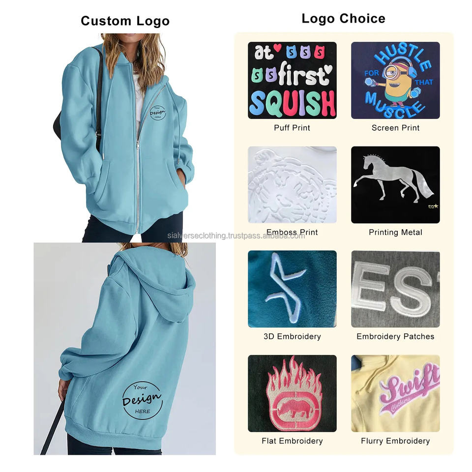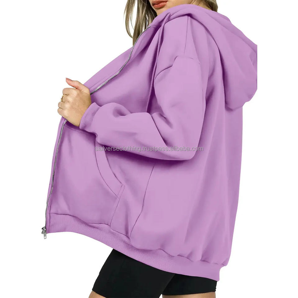 เสื้อฮู้ดผู้หญิงแบบลำลองสีทึบโอเวอร์ไซส์มีซิปออกแบบโลโก้ได้ตามต้องการเทคนิคซักกรดสไตล์สปอร์ต