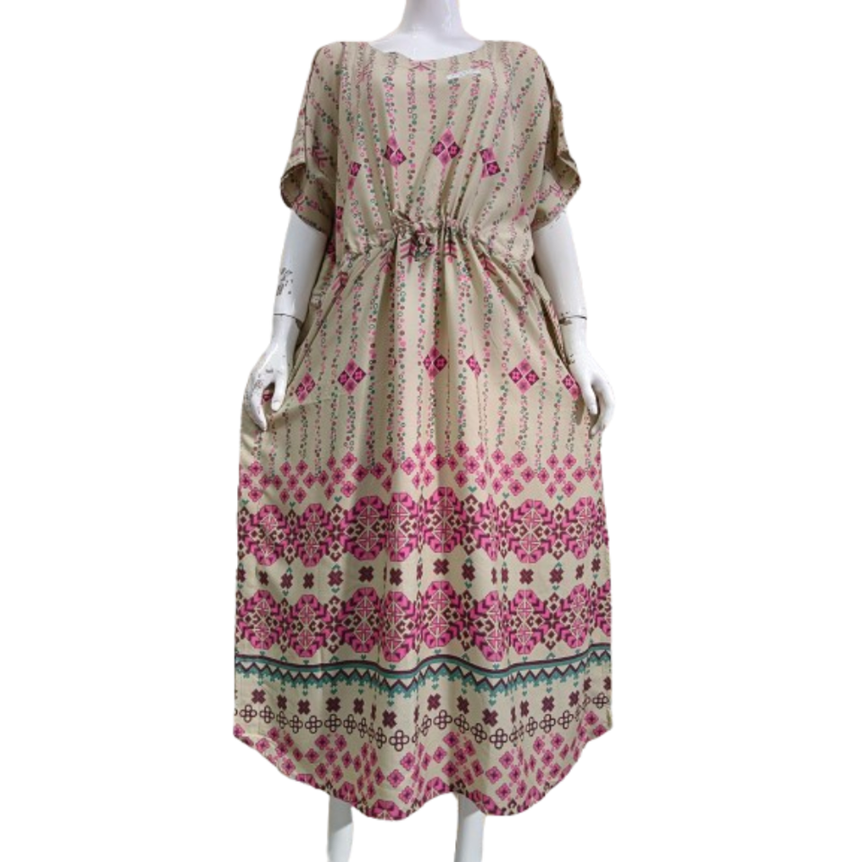 ชุดเดรสคาฟตันแขนสั้นลำลองทรงจัมโบ้ เอวสม็อคยางยืดพร้อมเชือกผูก ผลิตจากผ้าเรยอนคุณภาพสูงโดย Chrysanta