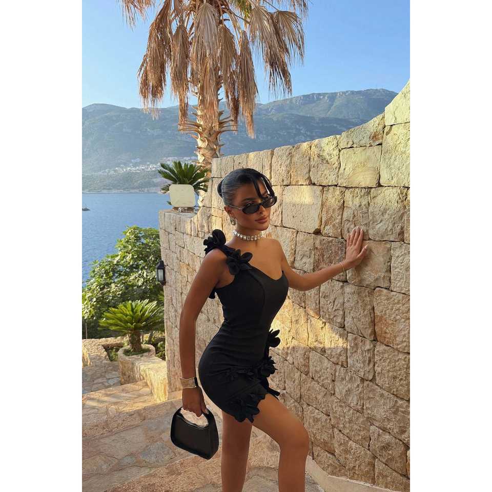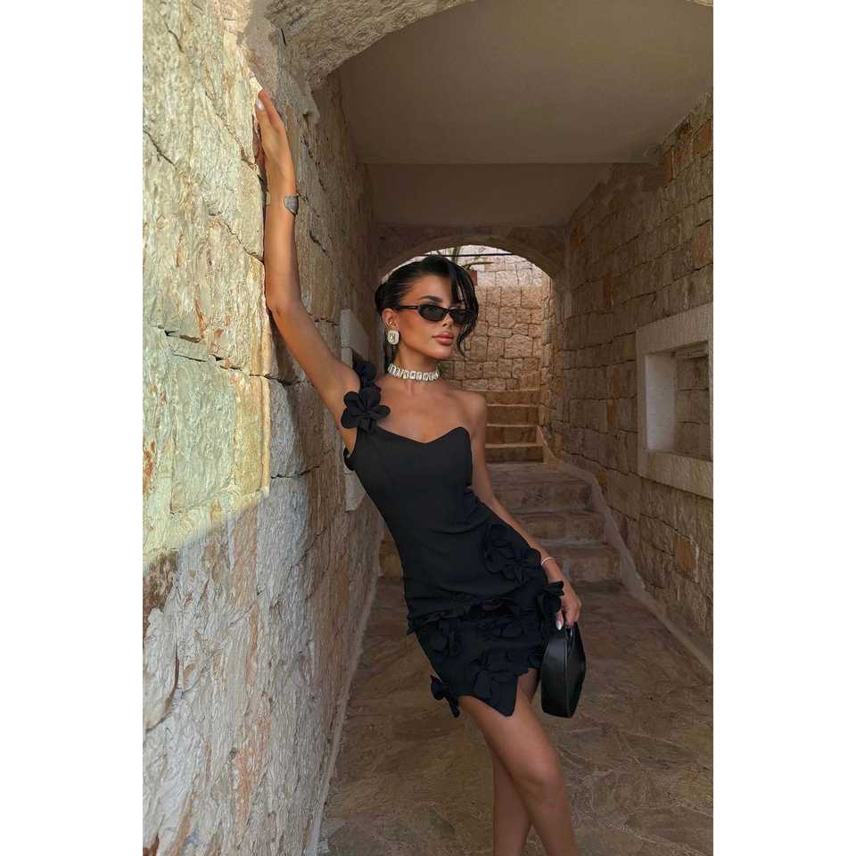 เดรสสั้นลายดอกไม้สีดำสำหรับผู้หญิง สไตล์ลำลอง คอเปลือย แต่งลายฉลุ ไซส์พลัส รับสกรีนโลโก้ ฟรีไซส์ สำหรับใส่ไปเที่ยวกลางวัน