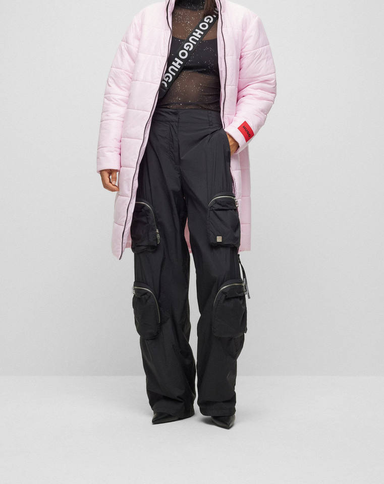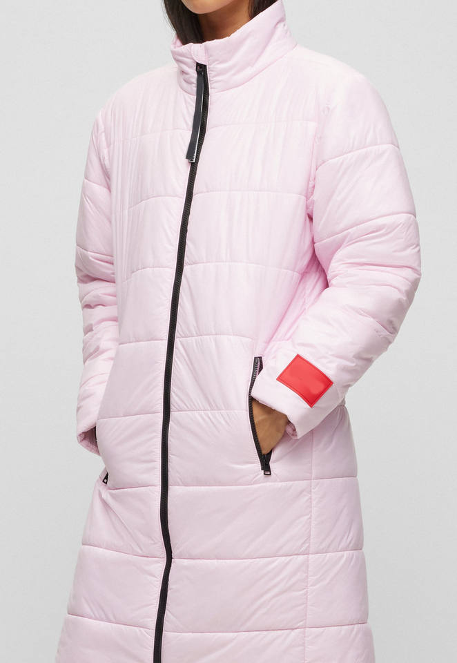 แจ็คเก็ตขนเป็ดสีชมพูสำหรับผู้หญิงแจ็คเก็ตตัวยาวโอเวอร์ไซส์ลำลองบุนวมน้ำหนักเบาออกแบบโลโก้ได้ตามต้องการ