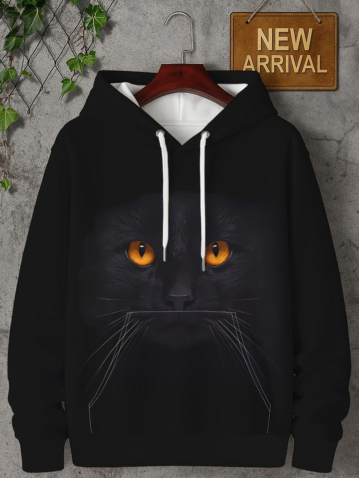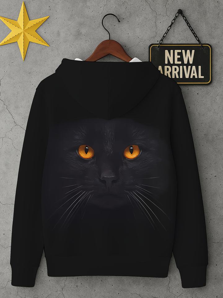 เสื้อฮู้ดผู้ชายแขนยาวสไตล์โกธิค พิมพ์ลายแมวดำสุดเท่ ตาสีส้มเรืองแสง หนวดกราฟิก พิมพ์ลายดิจิตอล 3 มิติ ผ้าซาติน แห้งเร็ว