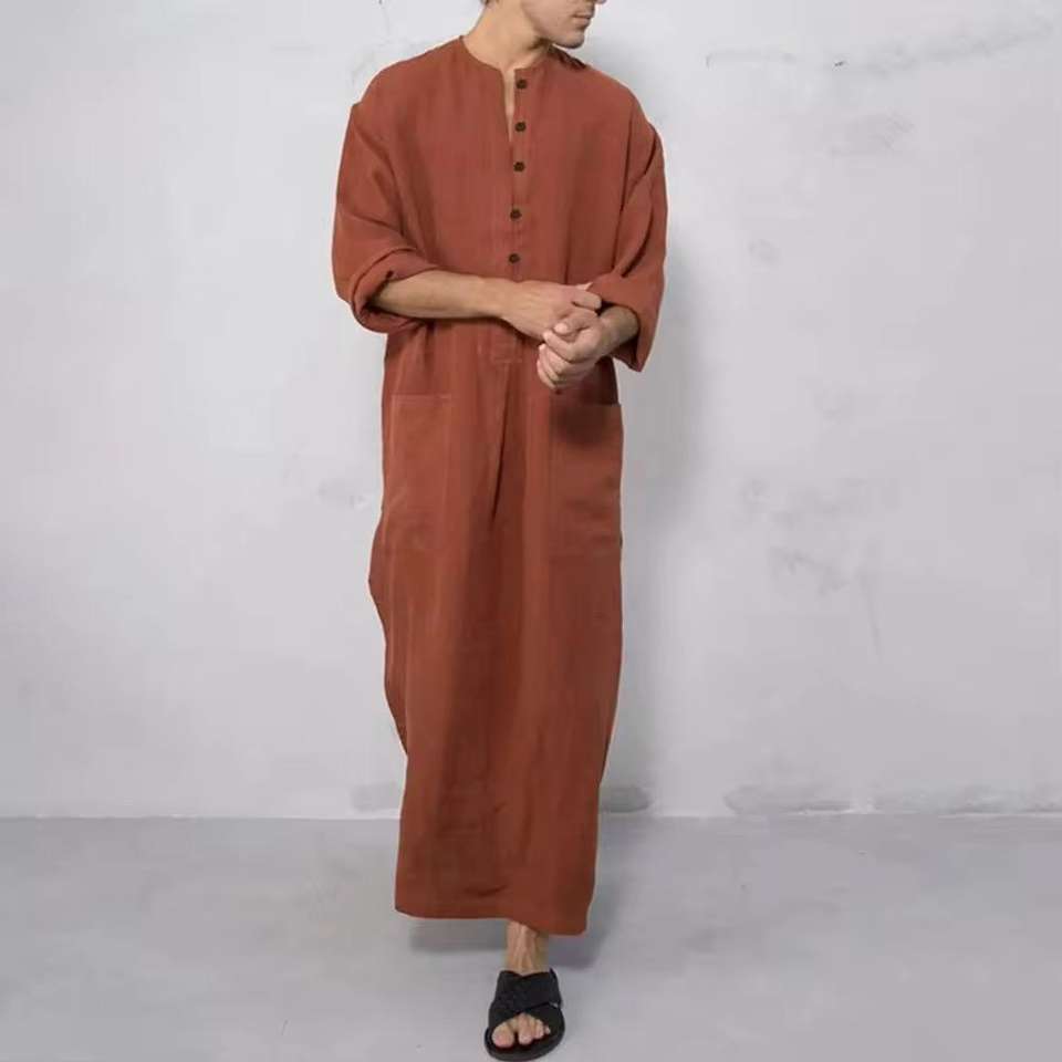 เสื้อคลุมชายแบบลำลองทรงหลวม คอวี แขนยาว ยาวคลุมเท้า มีกระเป๋าข้าง 2 ช่อง กระเป๋าใส่โทรศัพท์ด้านใน ผ้าฝ้ายระบายอากาศ เหมาะสำหรับใส่ไปชายหาดหรือสวมใส่เพื่อการสวดมนต์