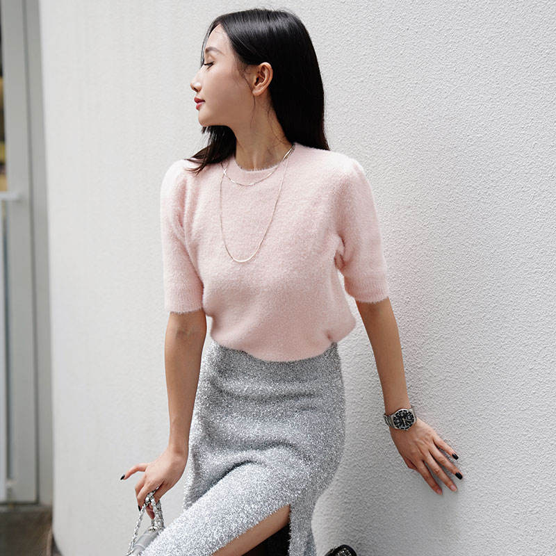เสื้อสวมหัวถักลำลองน้ำหนักเบา, เสื้อสเวตเตอร์คอกลมแขนสั้นสำหรับผู้หญิงเสื้อฤดูร้อน