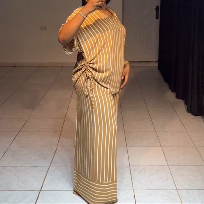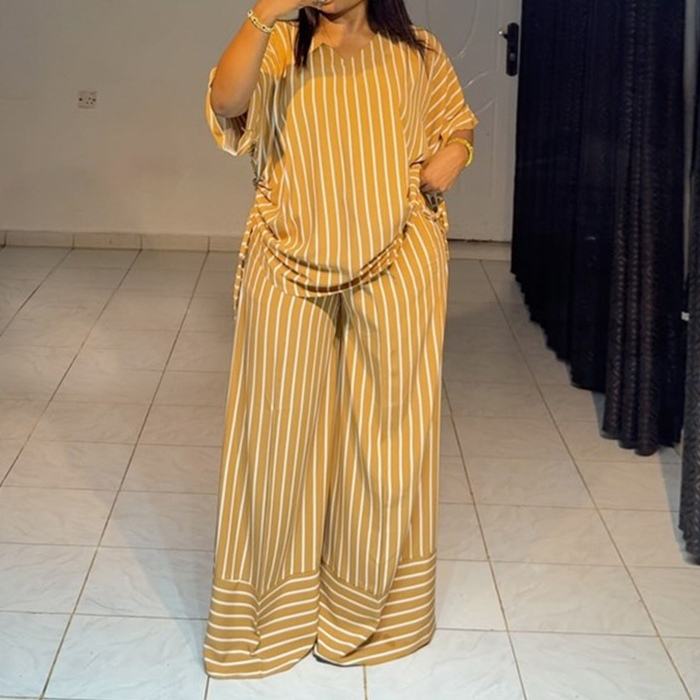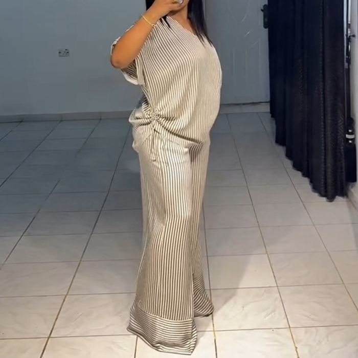 ชุดเซ็ต 2 ชิ้น เสื้อคอวีลายทางแขนสั้นทรงหลวม กางเกงขายาวทรงกว้าง แฟชั่นสำหรับผู้หญิง