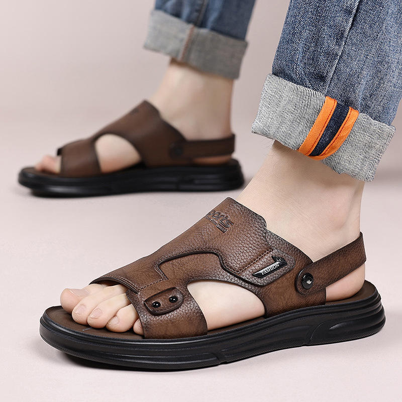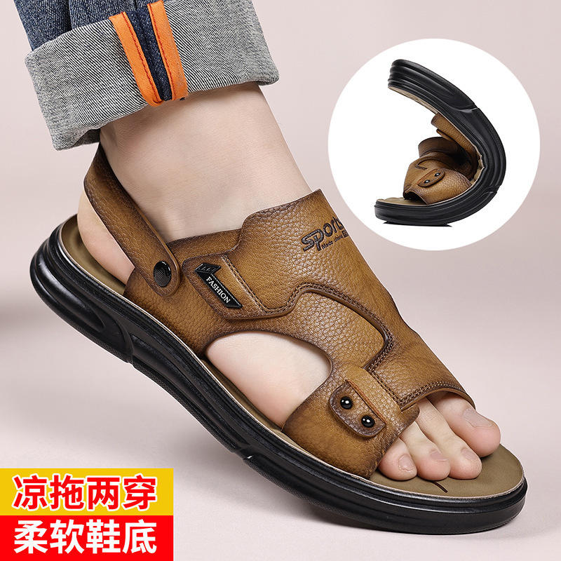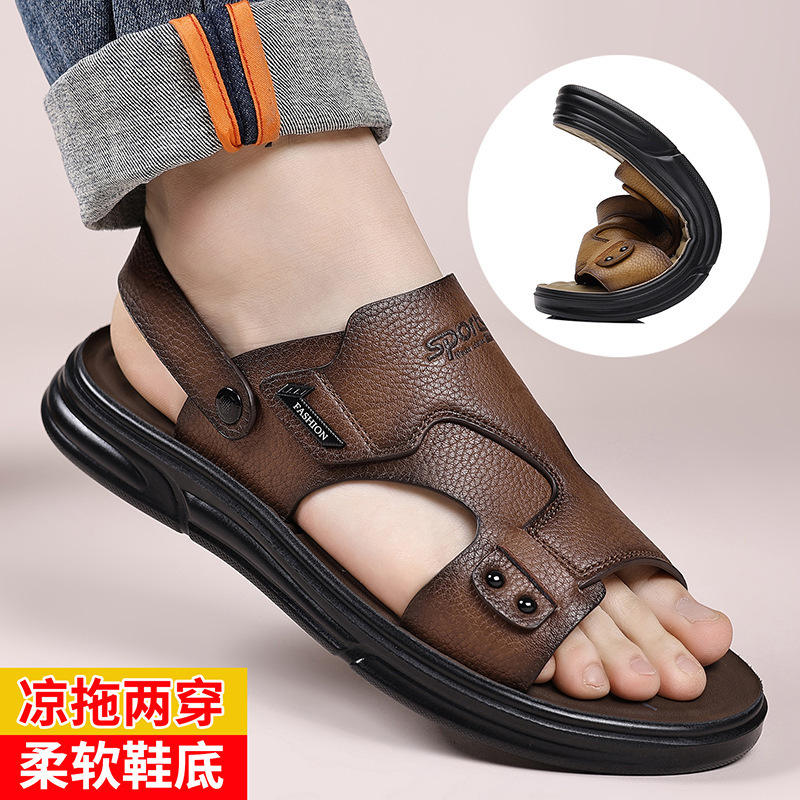 รองเท้าแตะหนังผู้ชายแบบสวมสองทาง พื้นนุ่ม ส้นแบน กันลื่น รองเท้าชายหาด สไตล์ฤดูร้อน พื้นยาง