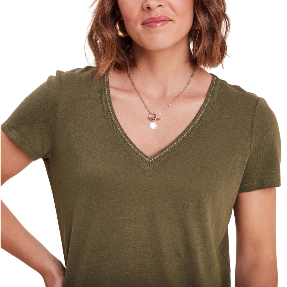 เสื้อยืดคอวีสีเขียวมะกอกลำลองสำหรับผู้หญิง ผลิตจากผ้าฝ้ายยั่งยืน 100% แขนสั้น ลายสก็อต แห้งเร็ว