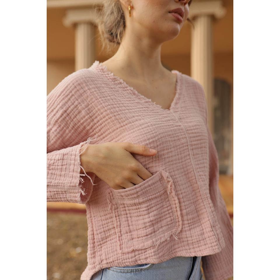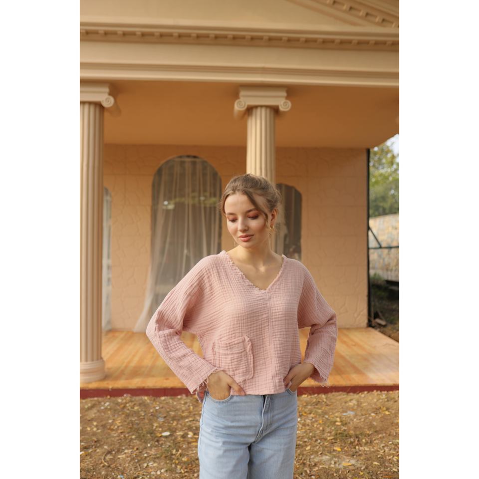 เสื้อยืดผู้หญิงมัสลินสีชมพูลำลองชุดสบายๆ