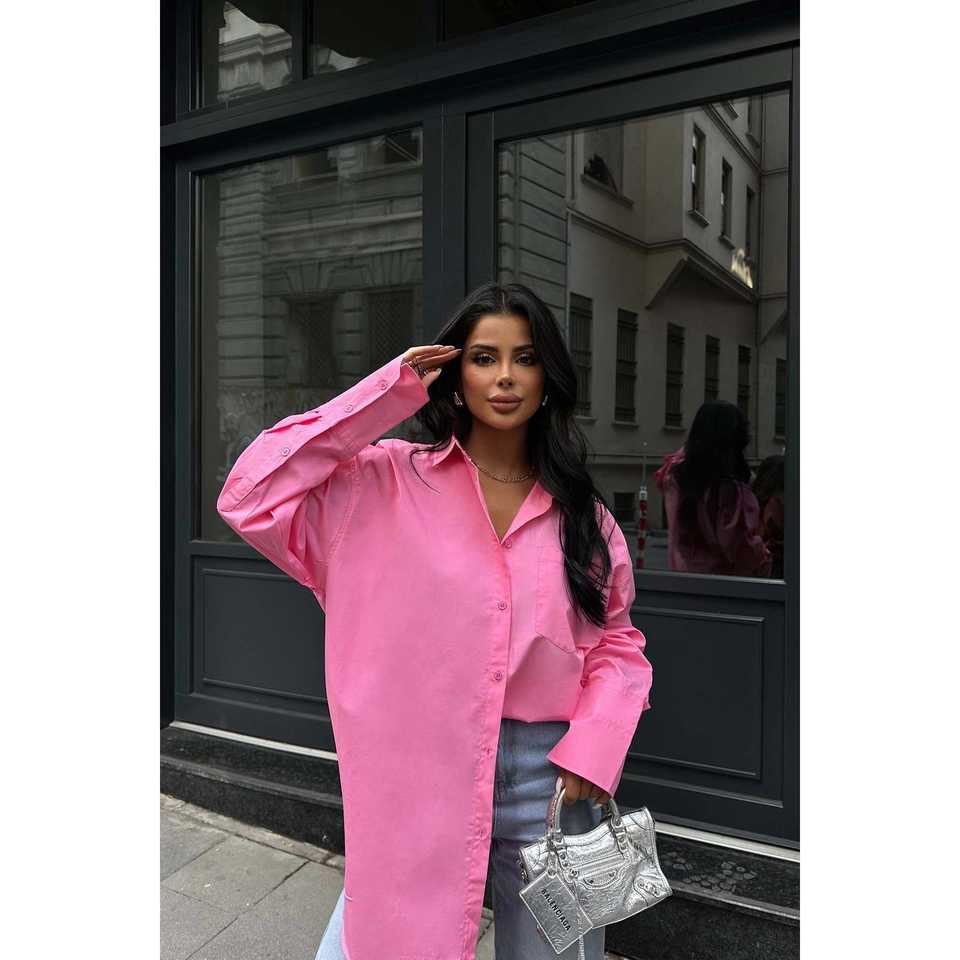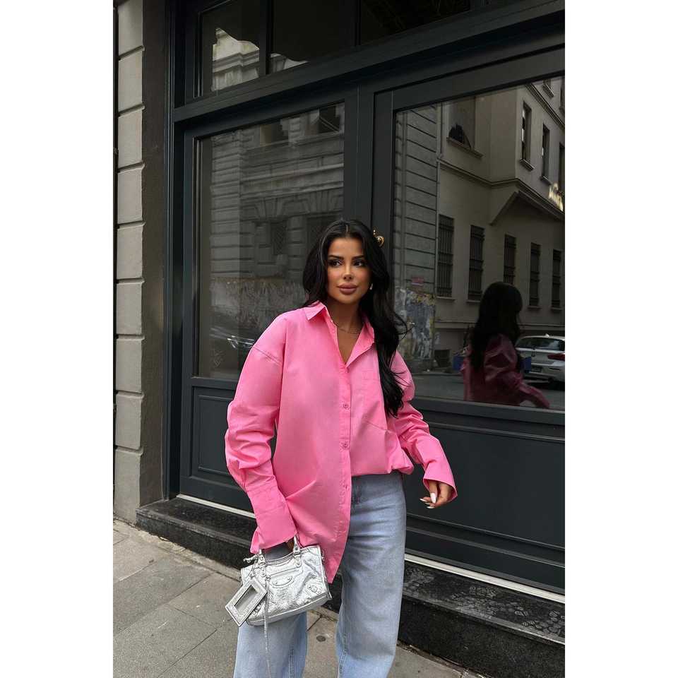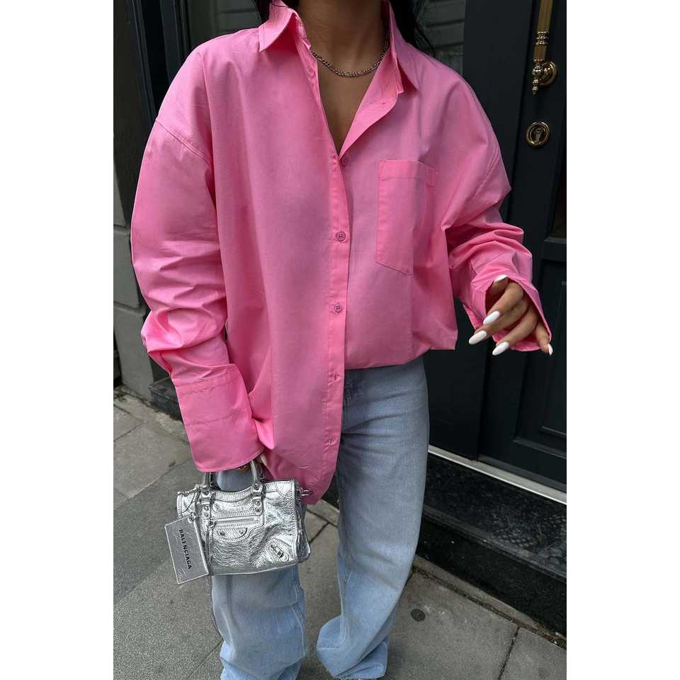 เสื้อเชิ้ตผ้าป๊อปลินสีชมพูสไตล์ลำลอง ปักลายทาง แต่งกระเป๋าผ้าฝ้ายถักแบบวินเทจ สำหรับใส่ทำงาน ไซส์ XS ฤดูใบไม้ผลิ ฤดูร้อน ฤดูใบไม้ร่วง