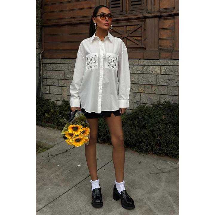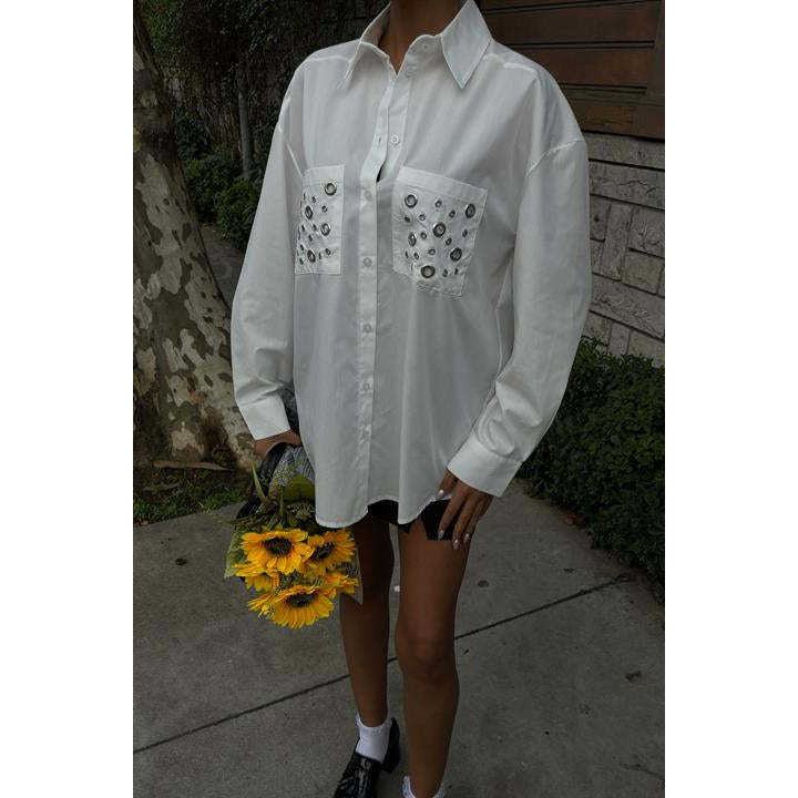 เสื้อเชิ้ตผ้าป๊อปลินลำลองพร้อมดีเทลตาไก่โลหะแบบเรียบง่าย 3453
