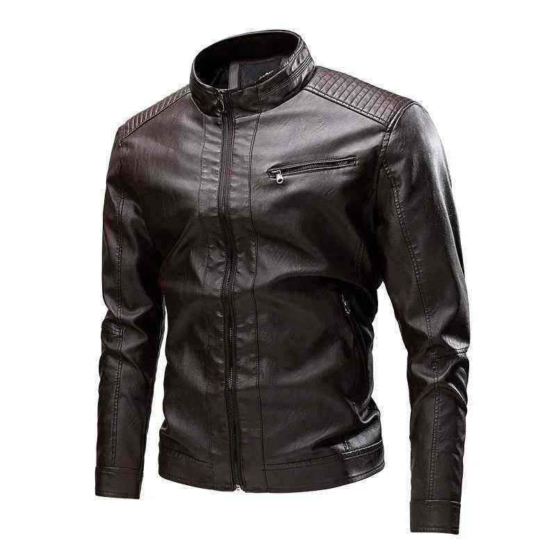 เสื้อแจ็คเก็ตหนังสีพื้นสไตล์ลำลองสำหรับชายหนุ่ม สไตล์มอเตอร์ไซค์ ทรงปกติ ทำจากหนังเทียมหรือหนังผสม