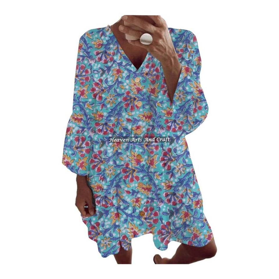 เสื้อผู้หญิงแขนกระดิ่งพิมพ์ลายลำลอง สวมใส่สบายๆ สำหรับฤดูใบไม้ผลิและฤดูร้อน ชุดเดรสพิมพ์ลายด้วยมือ สวมใส่สบายๆ สำหรับฤดูใบไม้ผลิและฤดูร้อน ชุดเดรสชายหาด